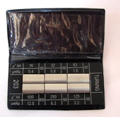 Набор образцов сравнения шероховатости поверхности по ГОСТ 9378 представляет собой набор пластин, полученных разными видами обработки (точение, фрезерование, строгание) с различными номинальными значениями параметра Ra. Предназначен для контроля шероховатости поверхности изделий на рабочих местах путем ее сравнения с поверхностью образца.